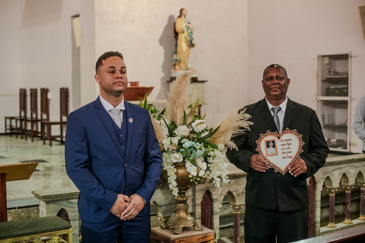 O pai dele entrou com uma foto da mulher, mãe do noivo, prestando uma linda homenagem já que ela não está entre nós.